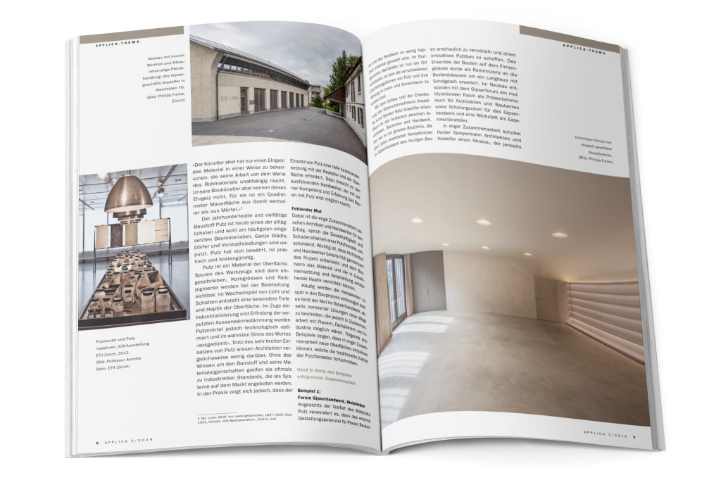 Pinar Gönül und Hartmut Göhler verfassen gemeinsam ein Plädoyer für mehr Pioniergeist im Gipserhandwerk. In ihrem Artikel «Teamwork Putz» heben sie die Bedeutung der Zusammenarbeit von Planern und Handwerkern hervor, damit jenseits von Standardlösungen vielfältige und anspruchsvolle Putzfassaden realisiert werden können. Erschienen ist der Artikel in der APPLICA, 03/2019.