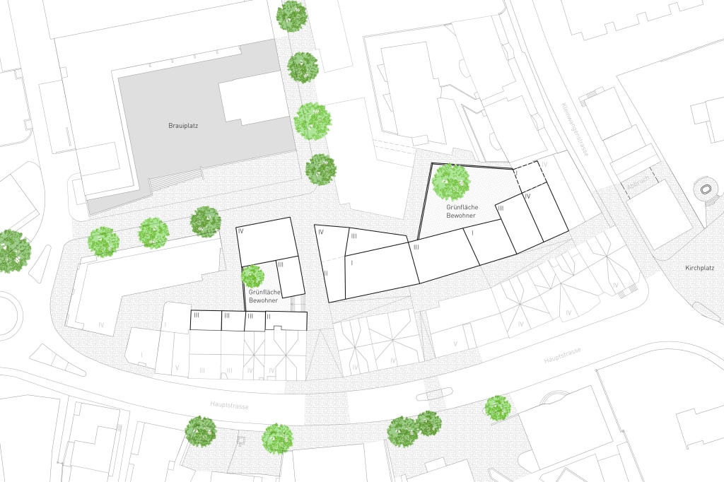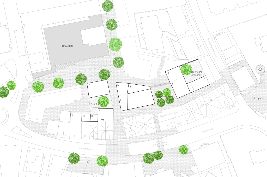 Im Quartierstrukturplan werden für beide städtebaulichen Ansätze Konzepte für Verkehr, Freiräume und Nutzungen angedacht. Es entstehen attraktive Raumfolgen und neue Verbindungswege, welche die Anbindung vom Braui-Platz zur Hauptstrasse attraktivieren und auch den Kirchplatz näher ins Zentrum rücken. Die rückwärtige Rosengasse wird ihrem Namen wieder gerecht und bietet idealen Raum für Wohnen, Arbeiten sowie Verkaufsflächen für kleine Geschäfte.